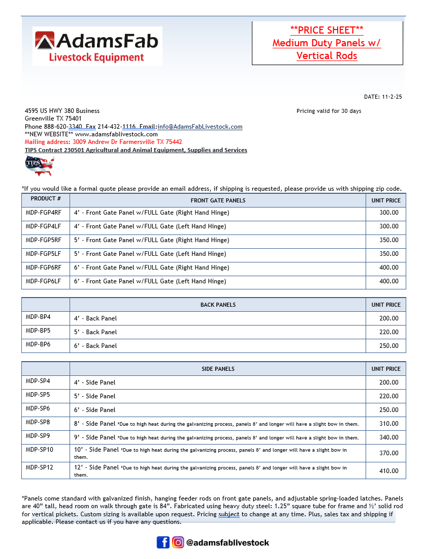*Panels come standard with galvanized finish, adjustable spring-loaded latches. Panels are 40” tall, head room on walk through gate is 84”. Fabricated using heavy duty steel: 1 ¼” square tube for frame, 1/2" solid rods for vertical pickets.