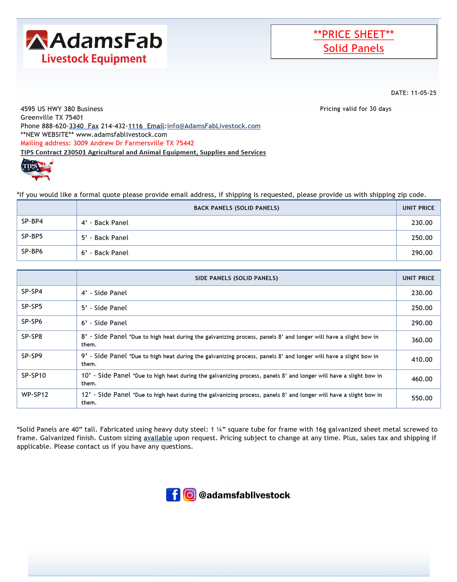 "Solid Panels" Price Sheet